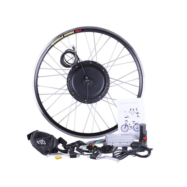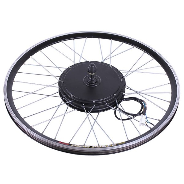 Elementele kit-ului sunt gata de instalare. Instalați ușor și fără probleme cu scaunele și clichetele. O roată asamblată și cu spițe cu motor electric de 48v 1000w este amplasată pe puntea față sau spate a bicicletei (în funcție de kit). O jantă puternică cu spițe întărite protejează motorul de deformare, este durabilă și rezistentă la stres.