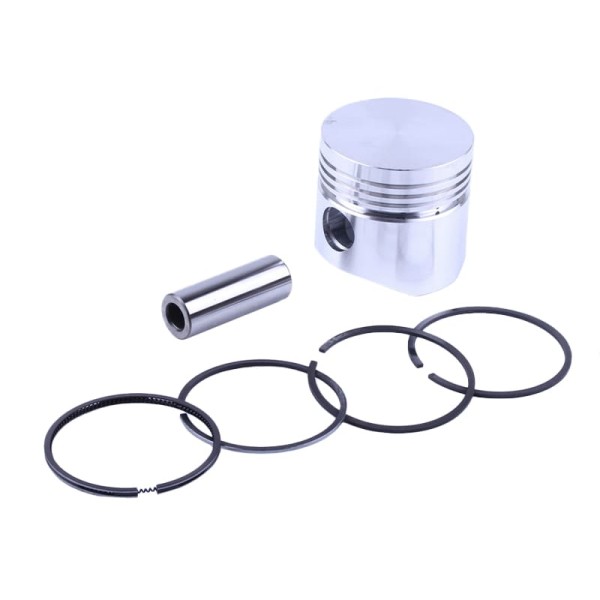 Поршень выполнен из прочного алюминиевого сплава с плоской верхней поверхностью, обеспечивающей оптимальную камеру сгорания и равномерное распределение давления. Кольца в комплекте обеспечивают герметичность камеры сгорания, предотвращая прорыв газов и утечку масла, а палец и стопорные кольца фиксируют поршень на шатунной шейке, гарантируя стабильное соединение при интенсивной работе мотора.