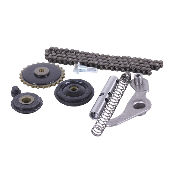 В комплект входит: цепь, 2 ролика натяжных, 1 ролик-успокоитель, коромысло, винт крепления коромысла, заглушка коромысла, пружина вала коромысла вал коромысла. Элементы идеально подобраны и согласованы между собой. Это гарантирует простоту ремонта и высокую надежность при эксплуатации транспортного средства.