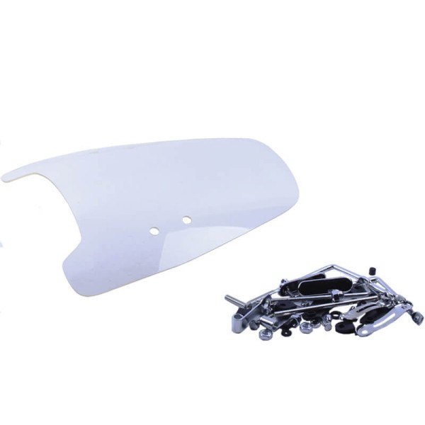Изготавливается из прочного прозрачного материала, устойчивого к ударам и перепадам температуры. Малый размер обеспечивает хороший обзор дороги и не создает дополнительной парусности, что особенно важно в городских условиях. Конструкция рассчитана на стандартные крепления китайских скутеров, поэтому установка обычно не вызывает сложностей и не требует доработок.
