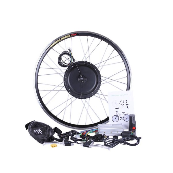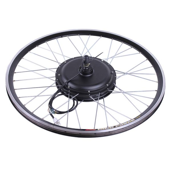 Элементы набора готовы к монтажу. Устанавливаются легко и без проблем с посадочными местами и трещотками. Собранное и заспицованное колесо с электродвигателем 48v 1000w, ставится на переднюю или заднюю ось велосипеда (в зависимости от комплекта). Крепкий обод с усиленными спицами защищает мотор от деформации, вынослив и стойкий к нагрузкам.