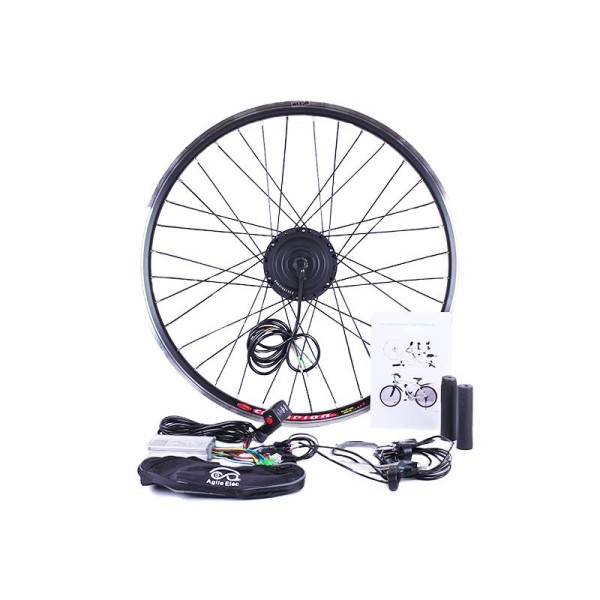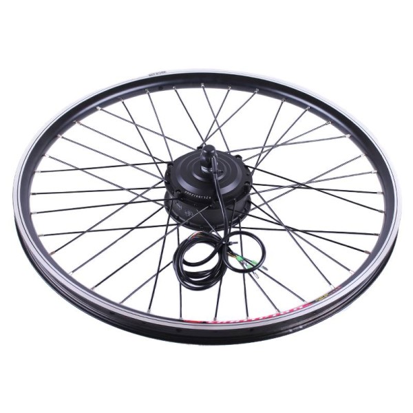 Элементы набора готовы к монтажу. Устанавливаются легко и без проблем с посадочными местами и трещотками. Собранное и заспицованное колесо с электродвигателем 36v 350w, ставится на переднюю или заднюю ось велосипеда (в зависимости от комплекта). Крепкий обод с усиленными спицами защищает мотор от деформации, вынослив и стойкий к нагрузкам.