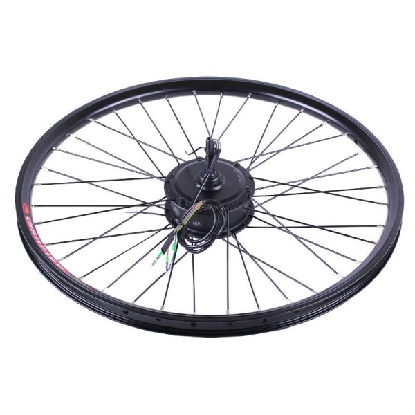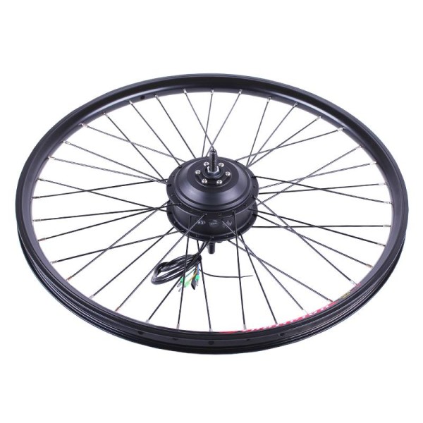 Элементы набора готовы к монтажу. Устанавливаются легко и без проблем с посадочными местами и трещотками. Собранное и заспицованное колесо с электродвигателем 36v 350w, ставится на переднюю или заднюю ось велосипеда (в зависимости от комплекта). Крепкий обод с усиленными спицами защищает мотор от деформации, вынослив и стойкий к нагрузкам.